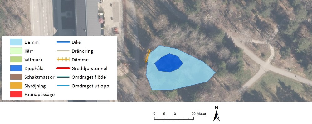 För att lokalen ska bli lämplig för groddjur krävs att dammen utformas så att den håller vatten över en längre tid. Detta kan åstadkommas genom att nivån för utloppet höjs, antingen med hjälp av ett dämme eller genom att nivån för inloppet till dräneringsröret höjs. Nivån för utloppet bör höjas så mycket som är möjligt utan att översvämma de kringliggande gångstigarna. Det bör även ske en viss sänkning av bottennivån genom grävning.