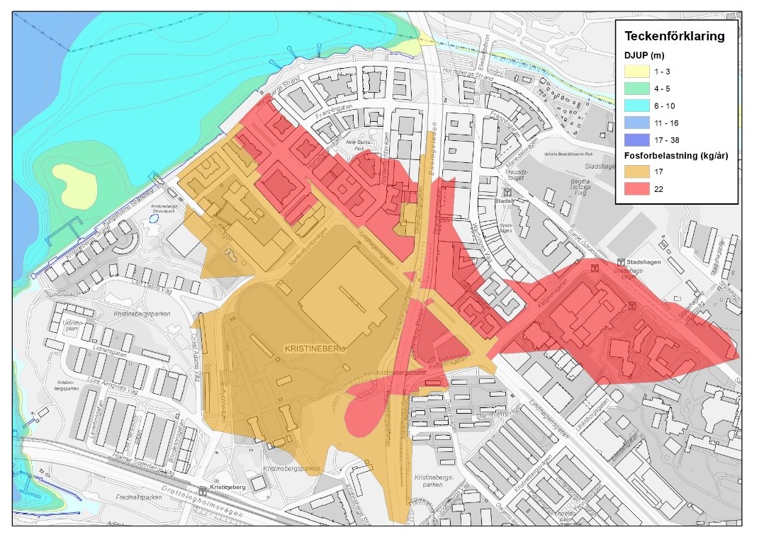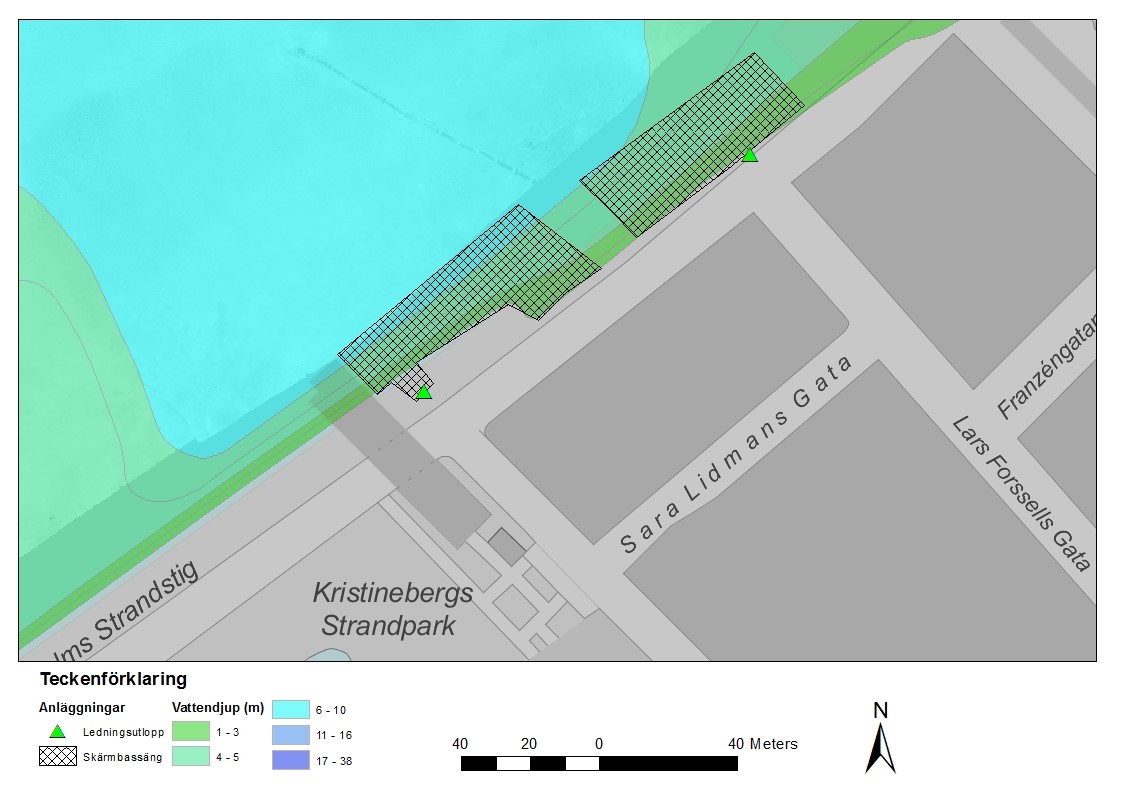 Vattenområdet där ledningarna mynnar är mer än 3 meter djupt, vilket innebär att inget befintligt grundområde tas i anspråk. Därför påverkar föreslagna skärmbassänger inte möjligheten att uppnå god hydromorfologisk status. Djupet gör också att det räcker att anläggningarnas storlek utgör 1 % av tillrinningsområdet.